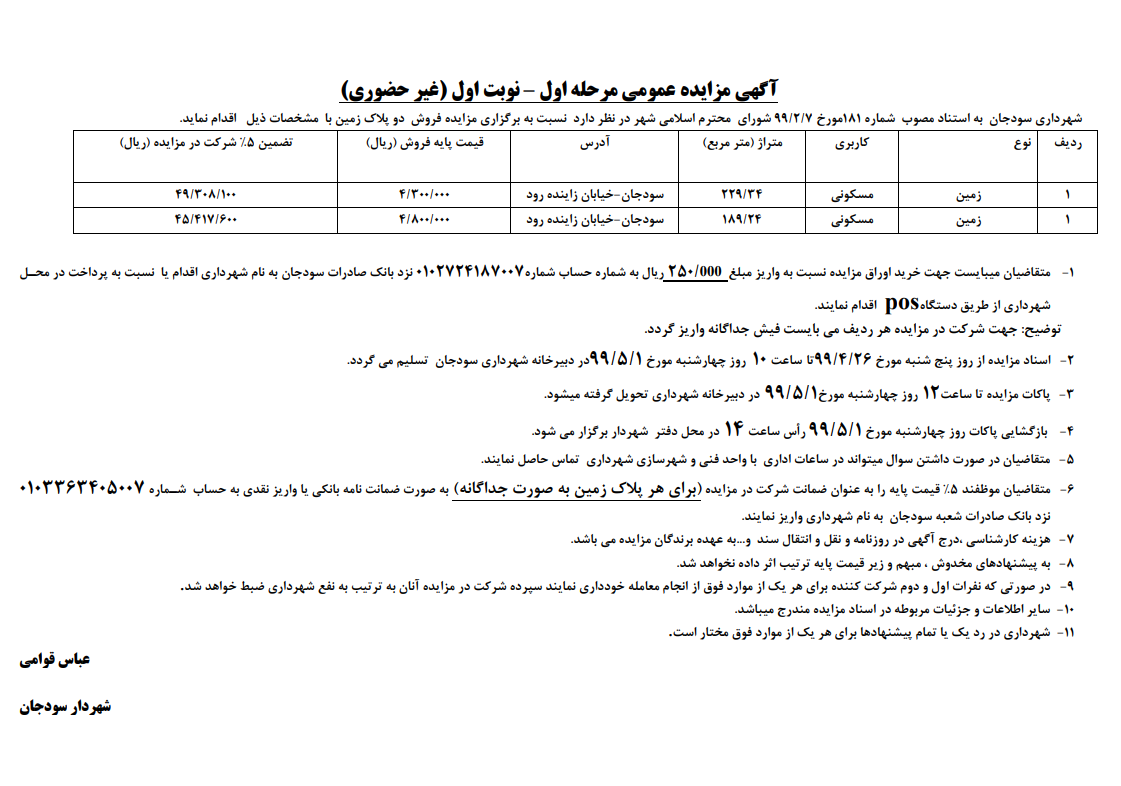 مزایده عمومی دو پلاک زمین شهرداری سودجان